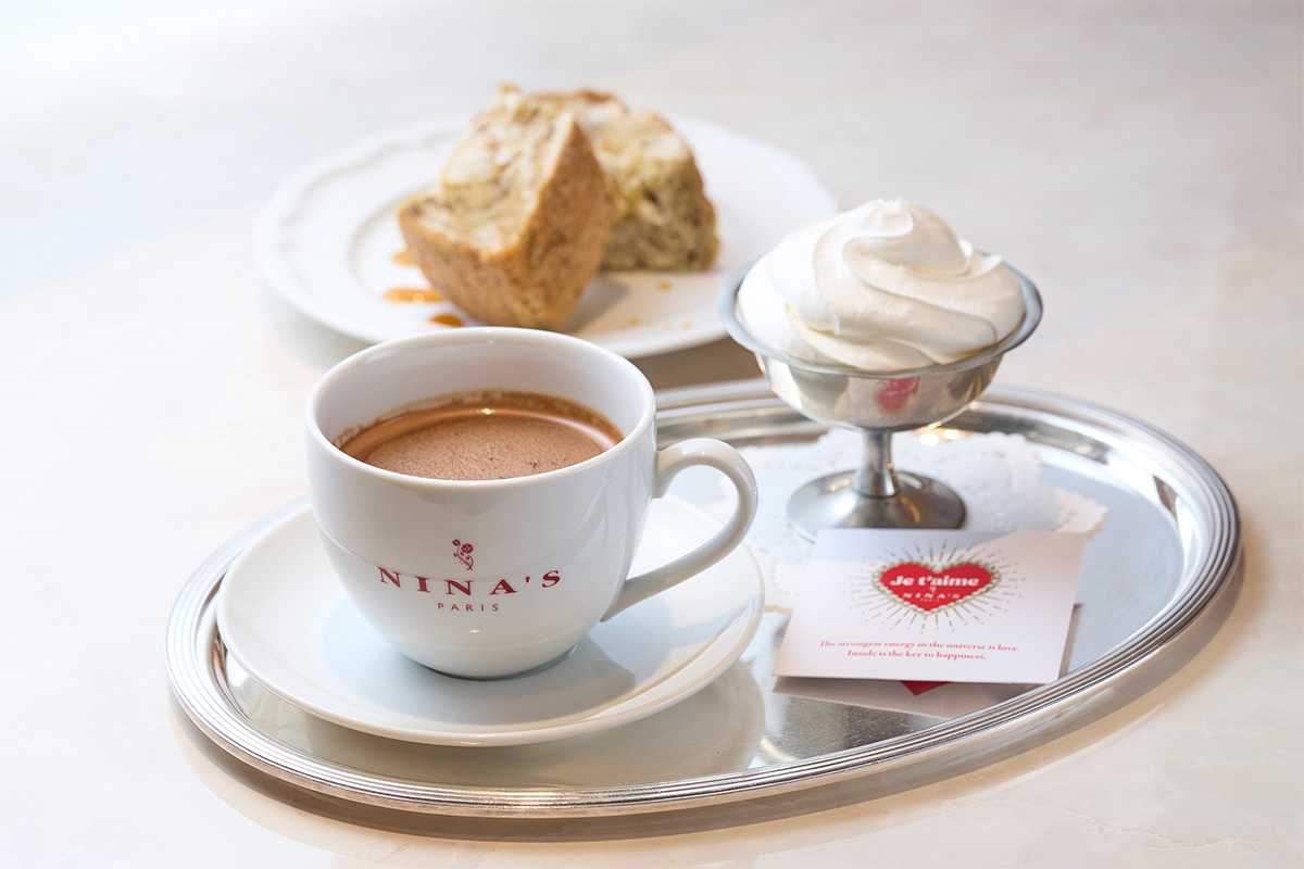 芳醇でなめらかな味わいのニナリス®・ショコラ・ショーに、ふんわりとクレーム・シャンティイを添えてご提供します。