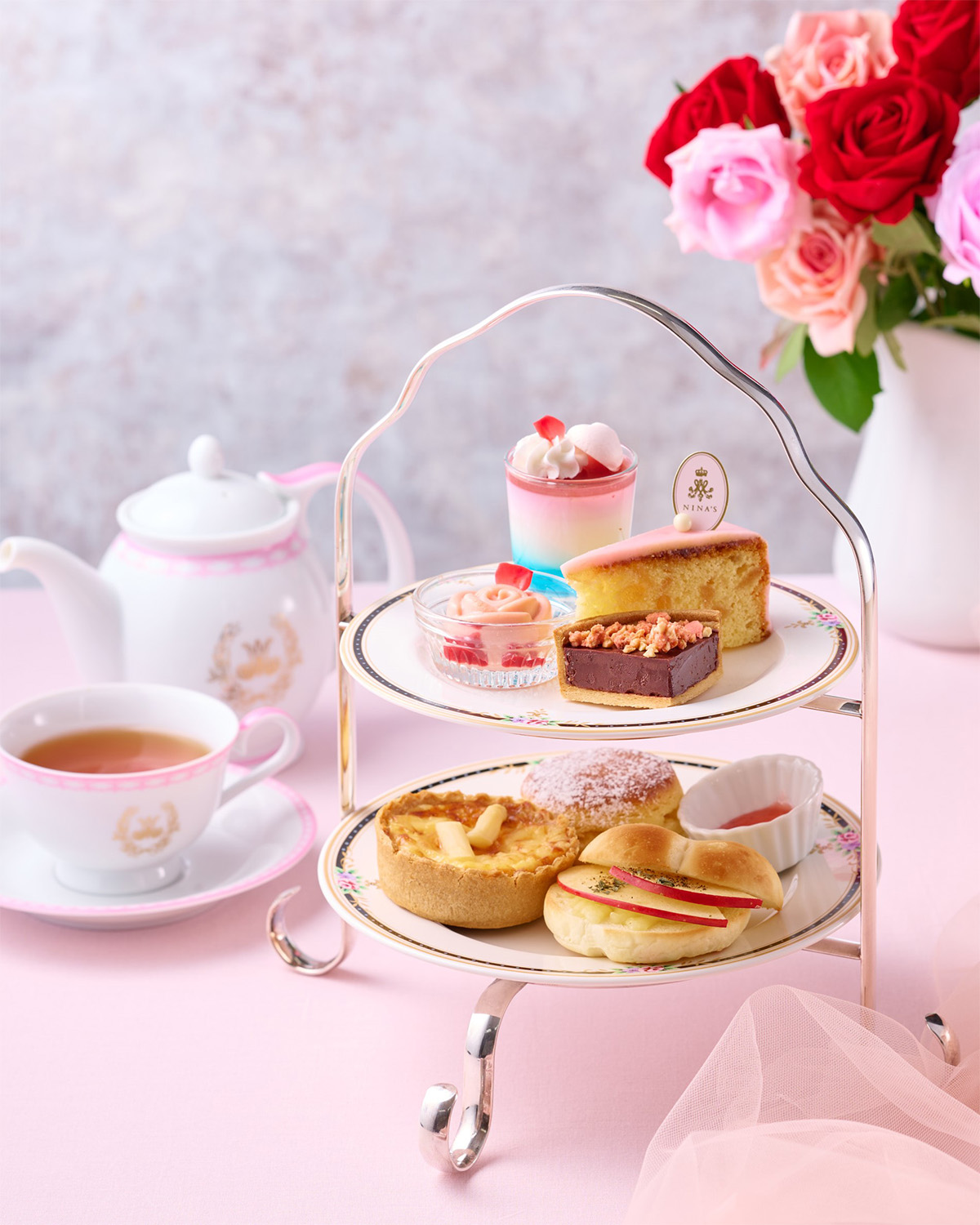 雪で白く覆われた冬に楽しむ暖かな室内でのティータイムをイメージした、白と赤のコントラストが華やかなアフタヌーンティーセットです。
