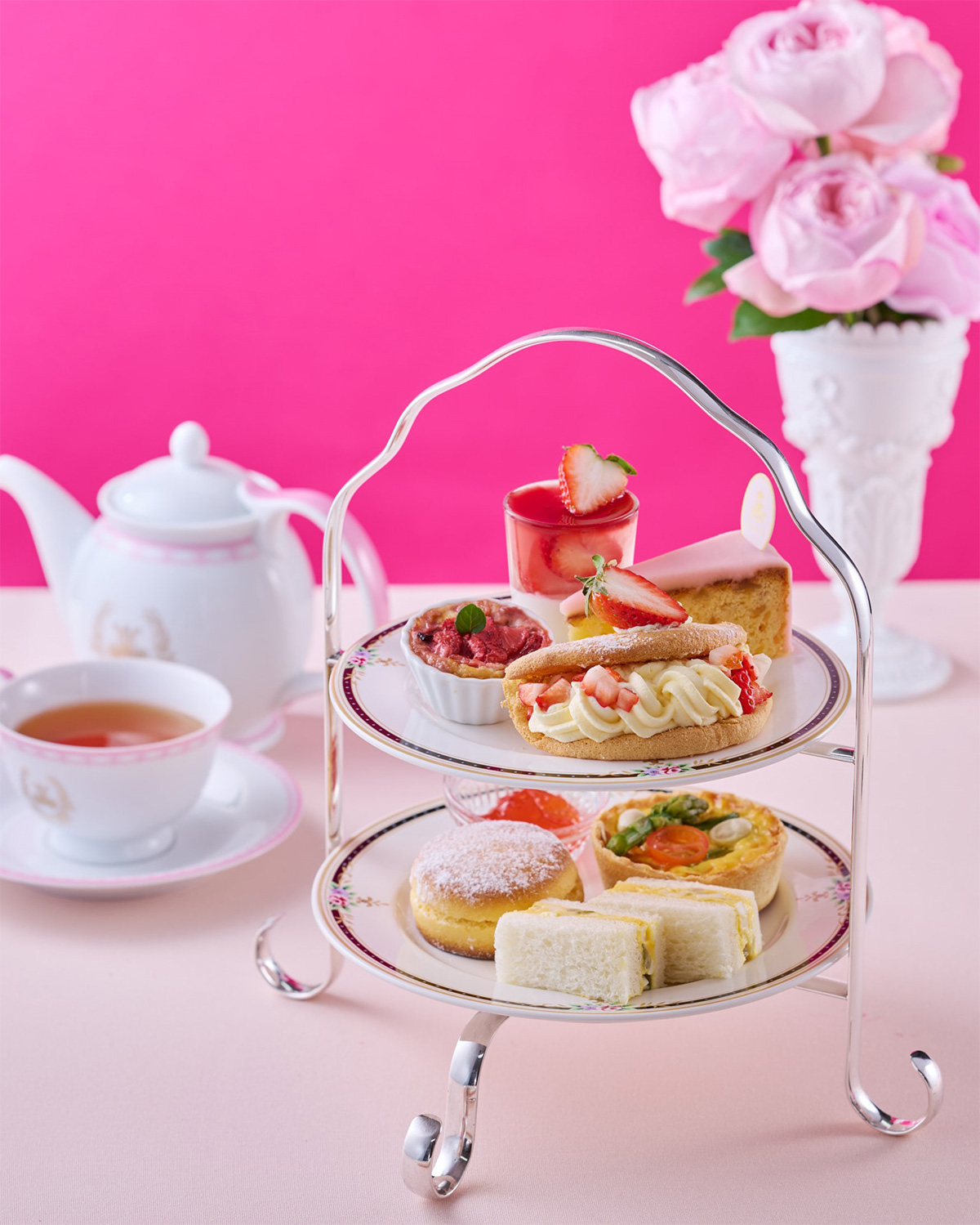 甘酸っぱい苺とピンクをテーマにした暖かな季節の訪れに心躍るアフタヌーンティーセットです
